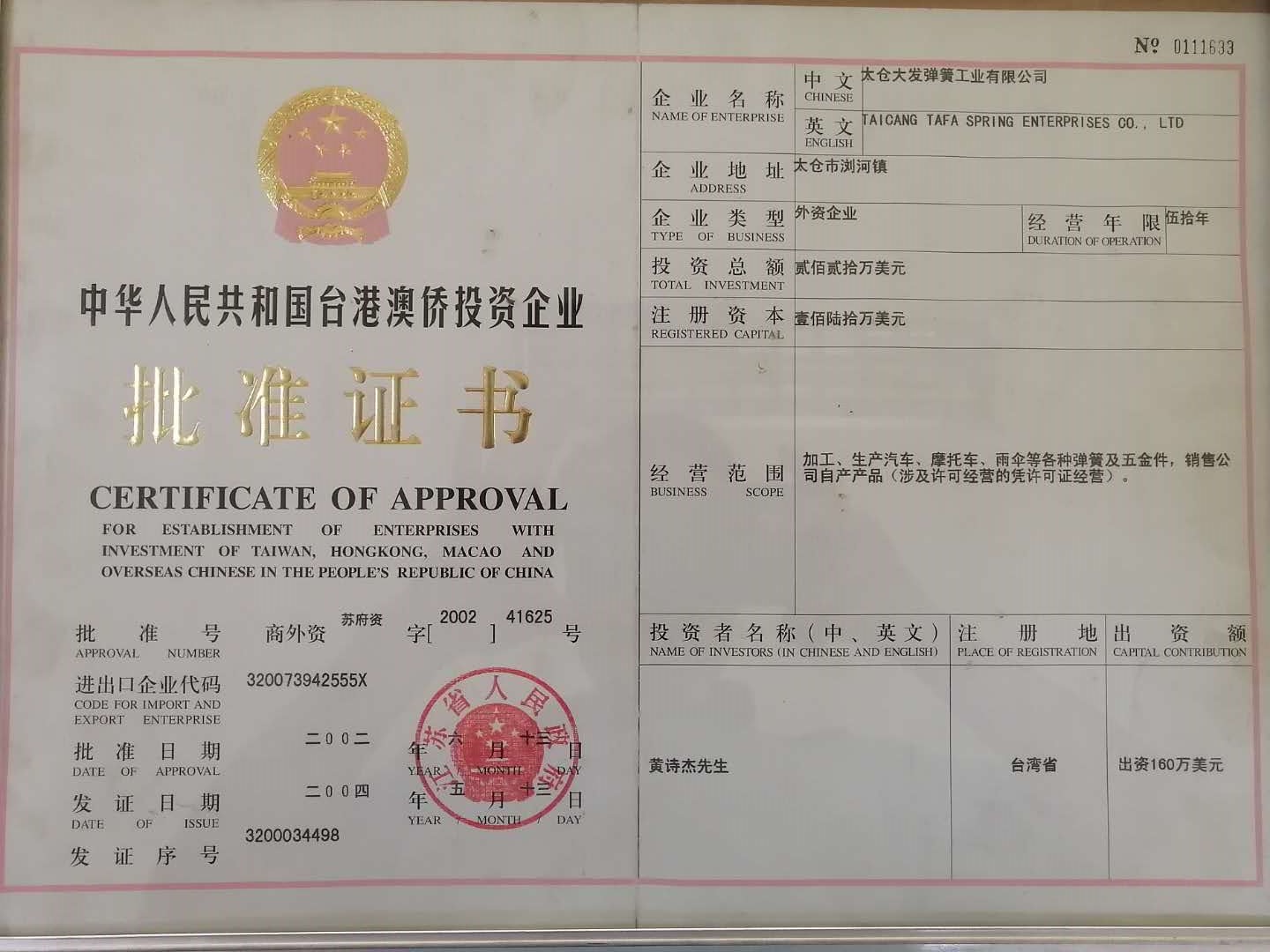 太倉大發彈簧工業有限公司由黃金樹先生于1967年始創于臺灣,是一個集雨傘、電子、五金機械、自行車、摩托車、汽車等的彈簧配件生產、加工、輔助設計服務的綜合性企業,其中1990年創辦的廈門大發彈簧公司、2000年創辦的深圳大發彈簧公司、2002年創辦的太倉大發彈簧公司均位于經濟發展地區,地理位置佳。我們憑借在彈簧制造業的多年豐富知識與技術,并著眼于以客戶為導向,秉持“以人為本,以質為先,以客為主,持續創新”的經營理念,強化競爭優勢。公司導入ISO9001: 2000質量管理體系,執行ISO14000:2000管理方式,倡導安全、高質量、高素質的生產。